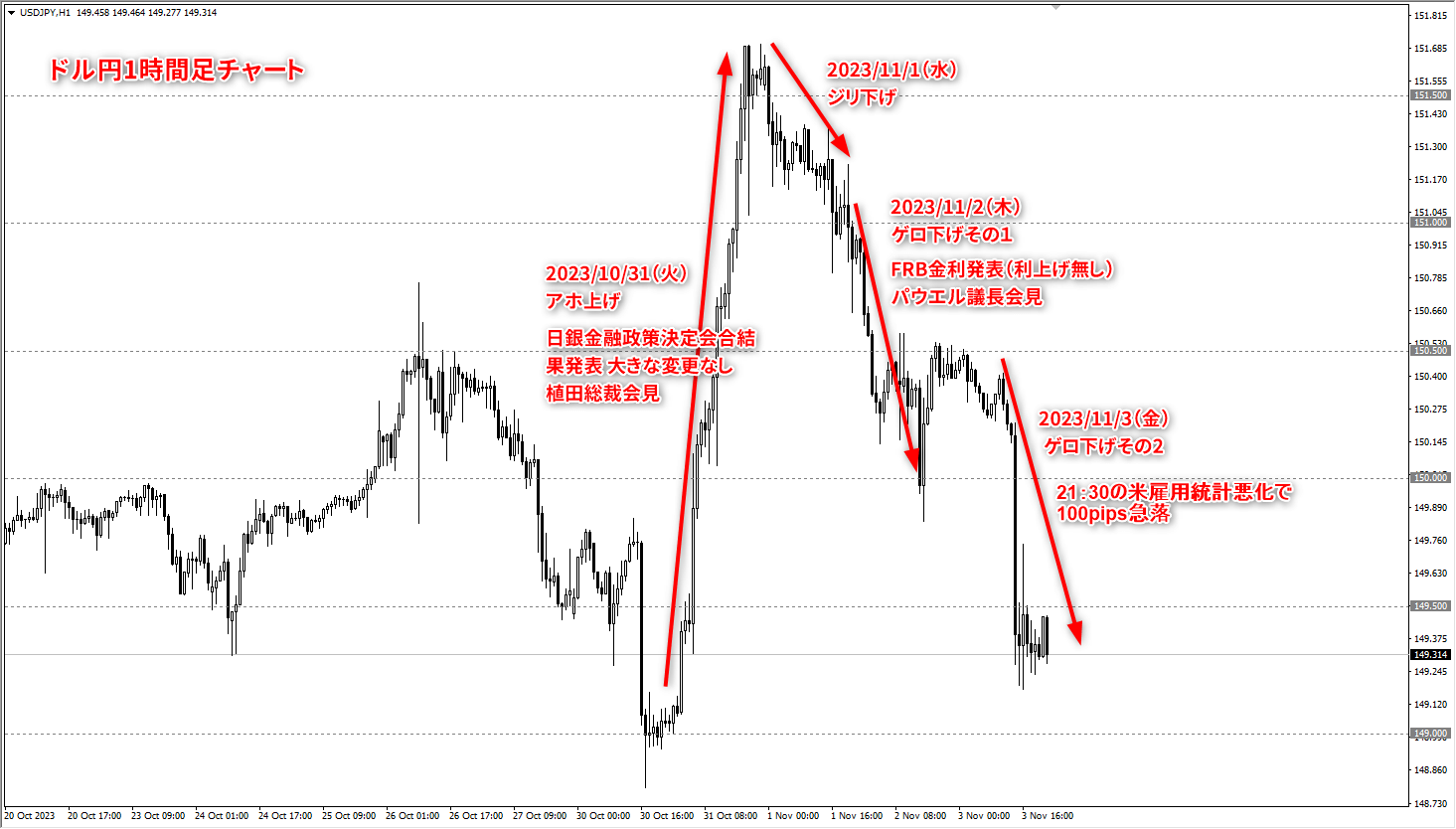 2023年10月30日(月)~11月3日(金)のドル円の動きと私のトレード結果メモです。
