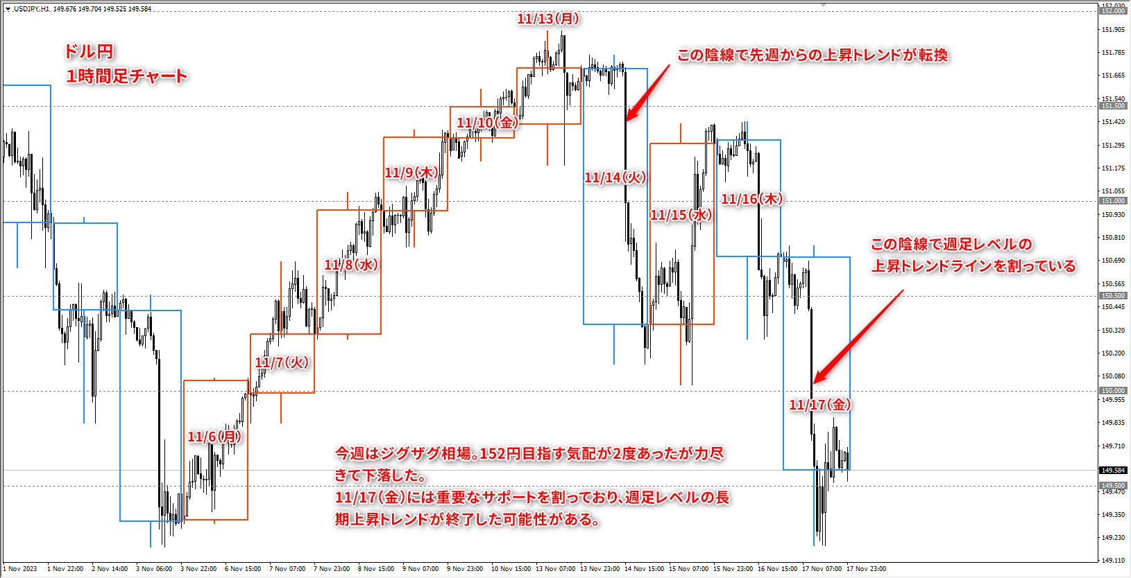 11/14(火)は米国指標(消費者物価指数)をきっかけに大きく下落しました。指標の値は市場予想通りだったのですが、サプライズなしということで152円を目指すパワーが切れたという感じでした。
