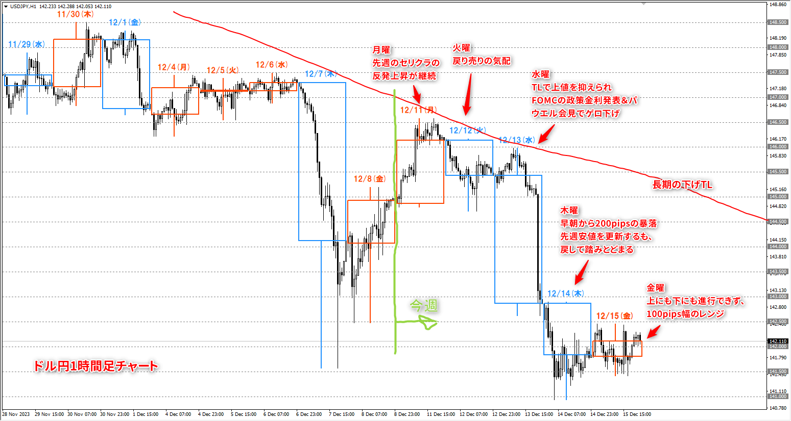 先週のセリクラの反動で月曜日は上昇、火曜、水曜は長期の下降トレンドラインに上昇を抑えられ、水曜深夜のFOMC政策金利発表で一気に下落しました。木曜日も東京時間の早朝から下落し、先週のセリクラの安値を更新しました。さすがに140円へ向かう動きまでは起きず若干戻しながらレンジで金曜日を終えました。