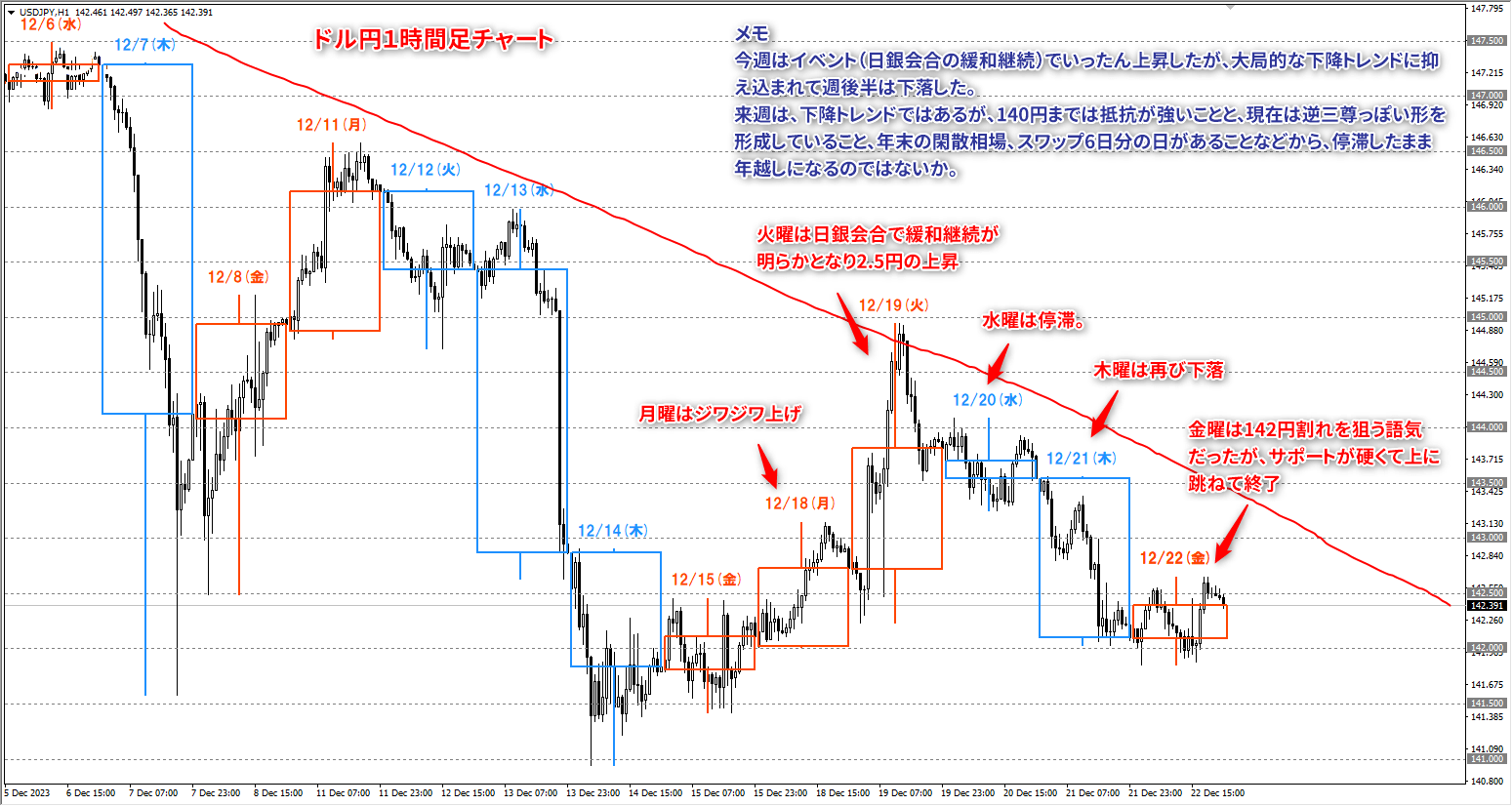 もう年末ということで、大局的には下降トレンドは崩れていなので、月足、週足的にはまだがっつり下げそうな形にも見えます。でも、141円、140円あたりはかなりサポートが強そうだし、日足以下のチャートは底堅い感じにも見えるので来週はいったん上昇するのではないかという気がしています。その後は、長期のトレンドラインで抑えられて年末を迎えるのかなという予想。年明けにも長期のトレンドラインを超えられないようなら年初から下落再開というストーリーをイメージしています。