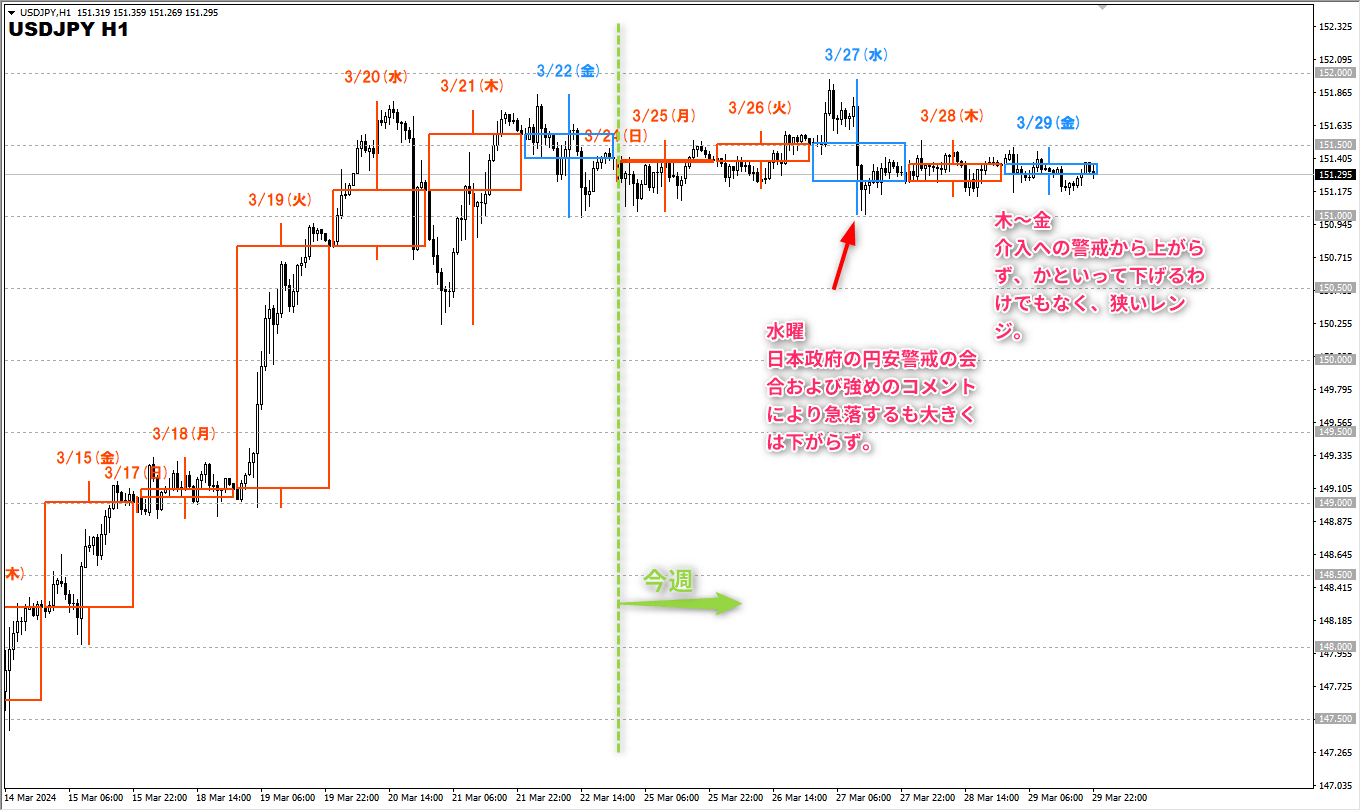 今週はとうとう152円に到達しそうな相場感でしたが、3/27(水)に日本政府から円安警戒の強めのコメントが出たため、151.0付近まで急落し、その後は週末クローズまで50pips程度の狭いレンジを行ったり来たり。