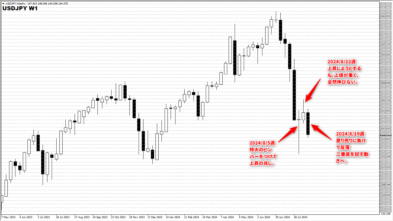 特大のピンバーも翌週に1本だけ陽線がでただけで、翌々週は陰線となった。特大ピンバーがだましとなってさらに深く掘る展開になるかもしれない。