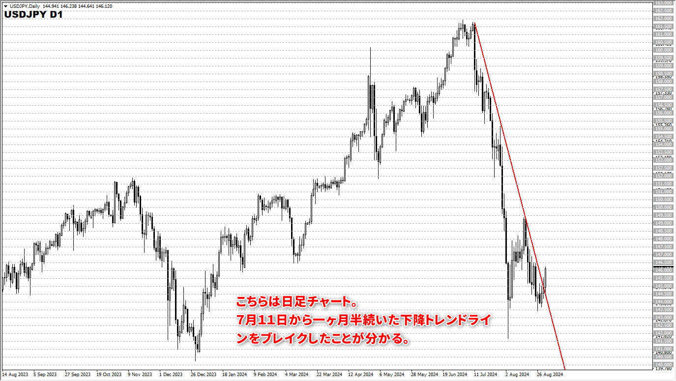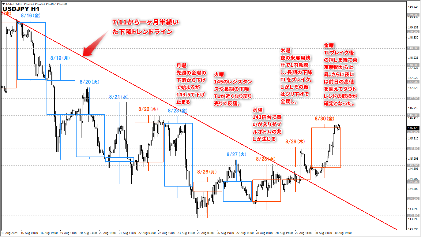 今週のドル円は前半は上下に行ったり来たりのレンジだったが、そこ固い動き。木曜夜に長期下降トレンドラインをブレイクしたことで1か月半続いた下降トレンドがようやく終了した。