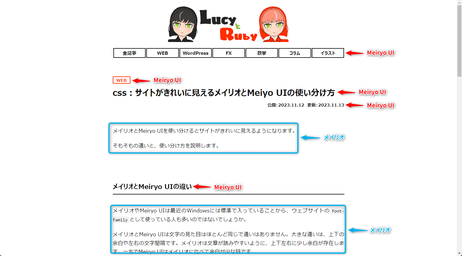 ちなみにこのサイトでの「メイリオ」と「Meiryo UI」の使い分けが下図。