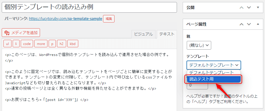 固定ページの場合は、以下の手順で簡単にテンプレートを差し替えられます。