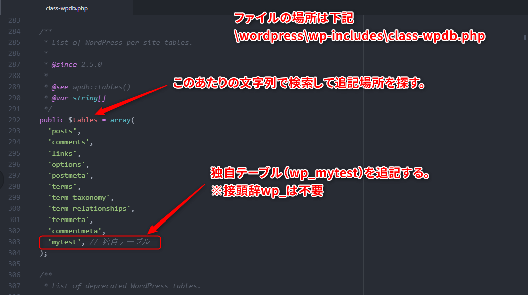 データベース設定ファイルを開き、ファイル内のpublic $tables = array(と書かれた箇所を検索します。そこにWordPressが参照するテーブル名がずらっと並んでいるので、独自テーブル名(接頭辞は除く)を追記して上書き保存します。
