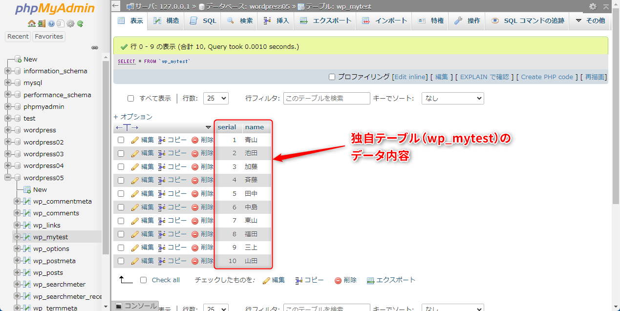 $sql = "SELECT serial, name FROM $wpdb->mytest ORDER BY serial ASC"; //データ抽出のsqlを作成